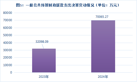 2024年度财政拨款支出70,065.27万元,占本年支出合计的100%。与2023年度相比,财政拨款支出增加37,967.18万元,增长54.18%。主要是工业和信息产业监管支出增加。