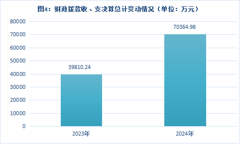2024年度收、支总计均为70,364.98万元,与2023年度相比,收、支总计各30,554.74万元,增长43.42%。主要是2024年电信普遍服务项目尾款追加及系统建设项目尾款追加经费及年初结转结余资金较多。