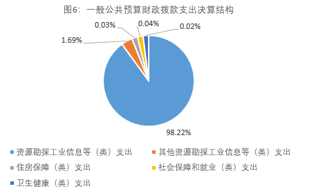 社会保障和就业(类)支出28.06万元,占0.04%;卫生健康(类)支出13.5万元,占0.02%;资源勘探工业信息等(类)支出68,816.75万元,占98.22%;其他资源勘探工业信息等(类)支出1,185.00万元,占1.69%;住房保障(类)支出21.96万元,占0.03%。